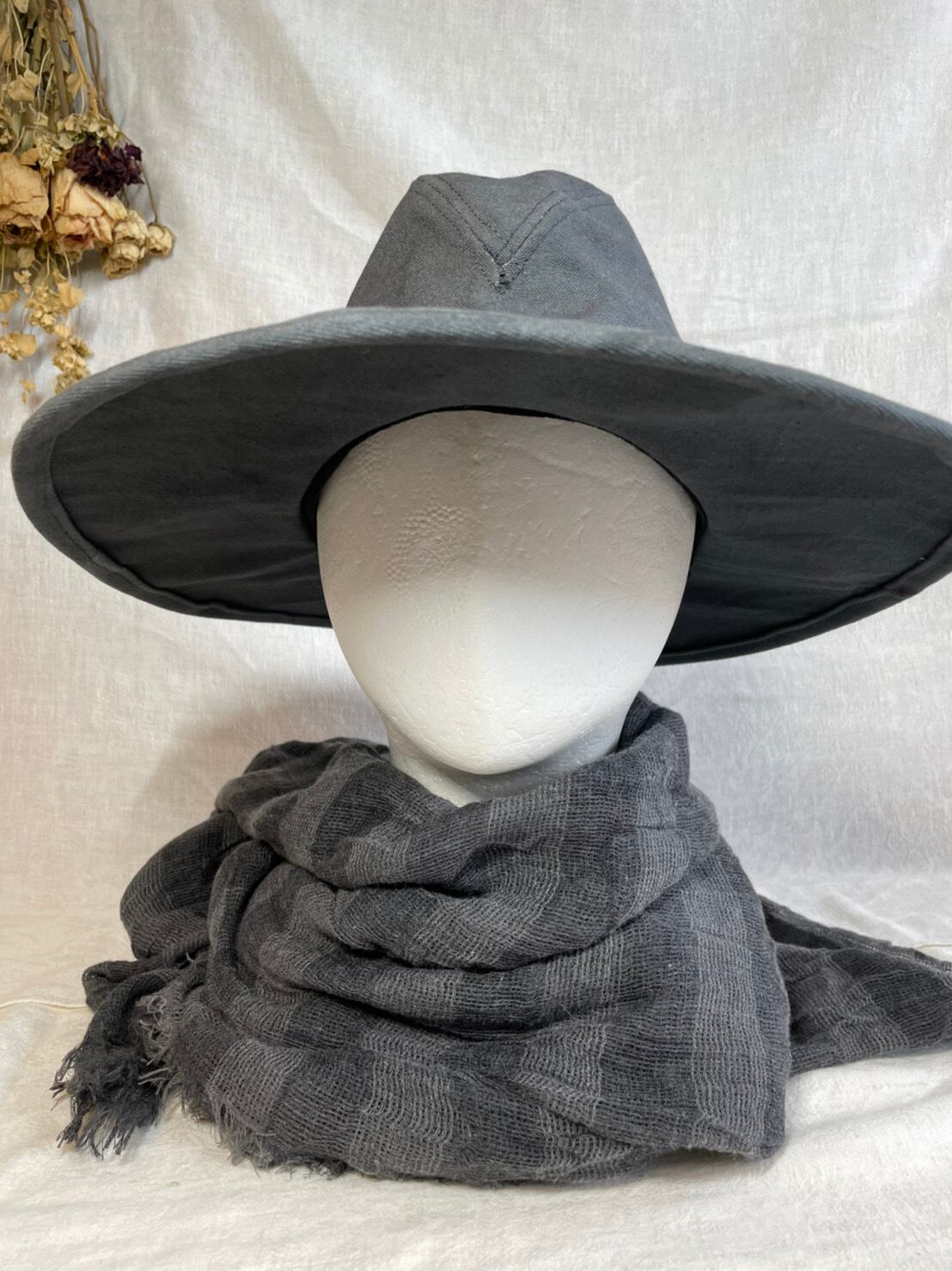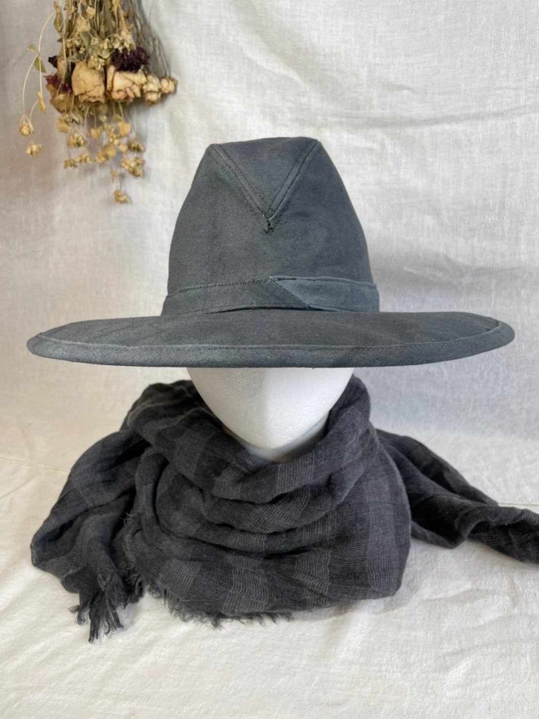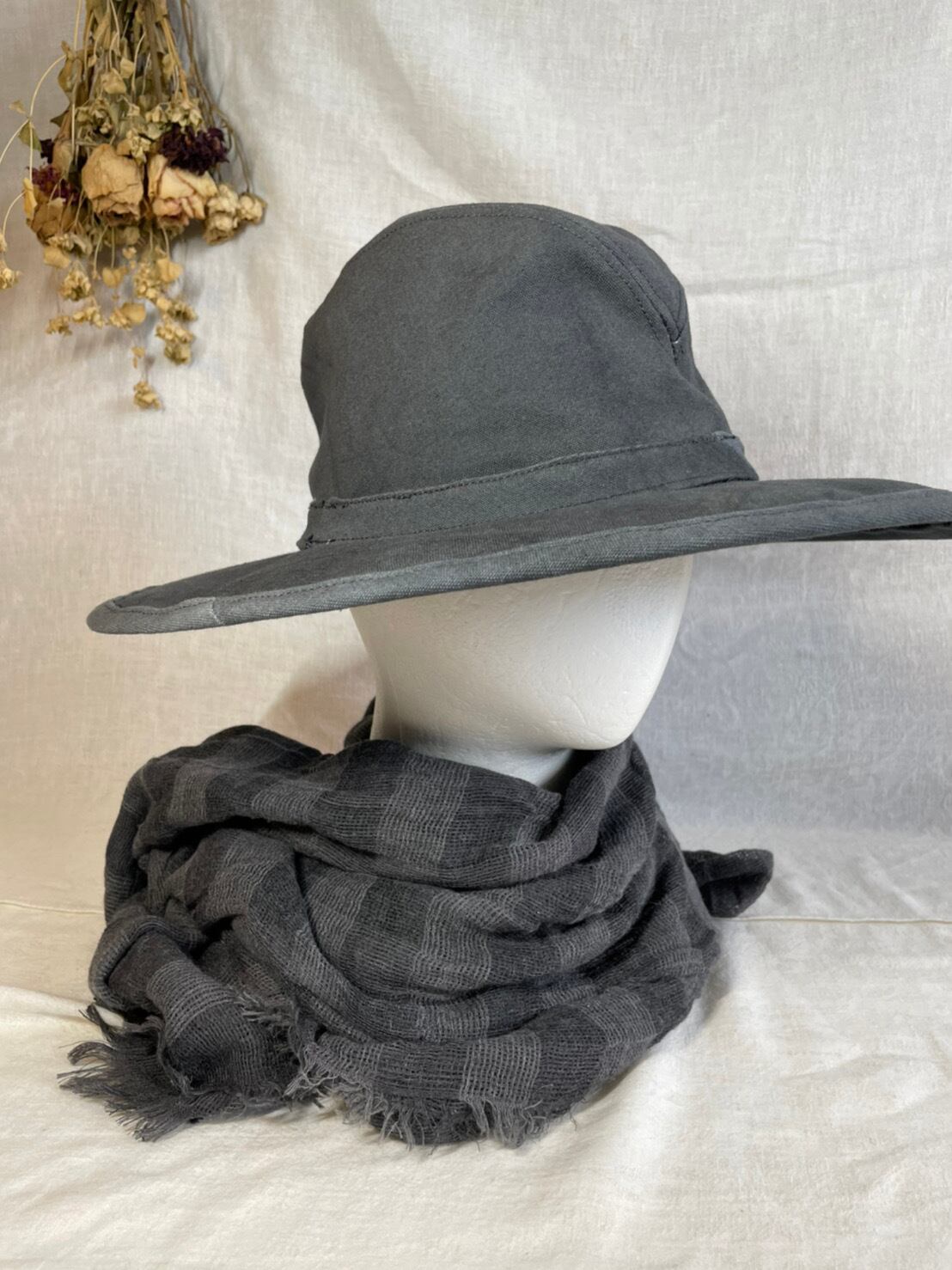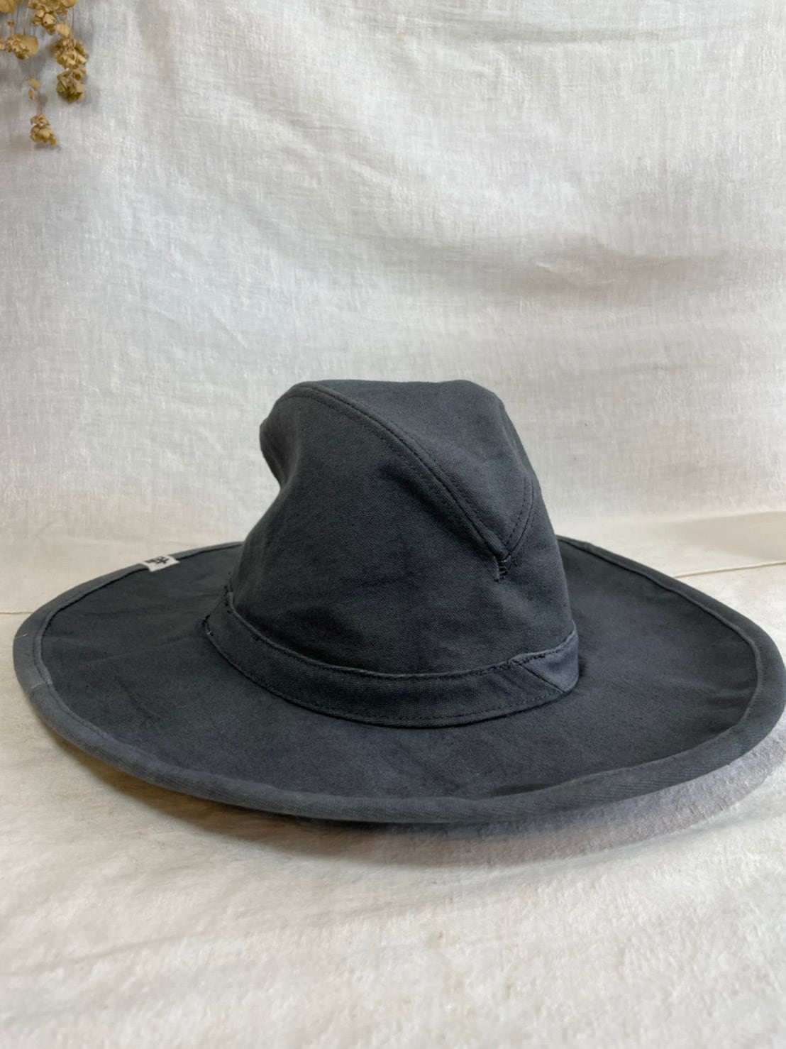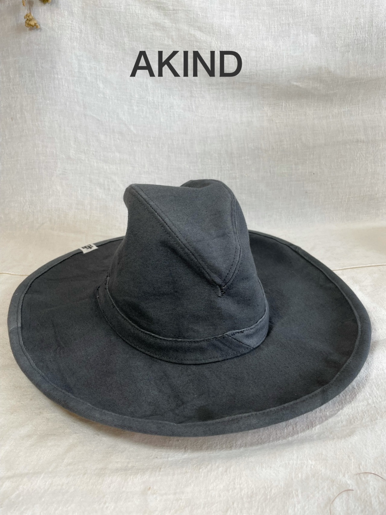 旅(巡礼)をコンセプトに旅人をデザインした染めムラとシンプルなクラウンが印象的なツバ広ハットです。