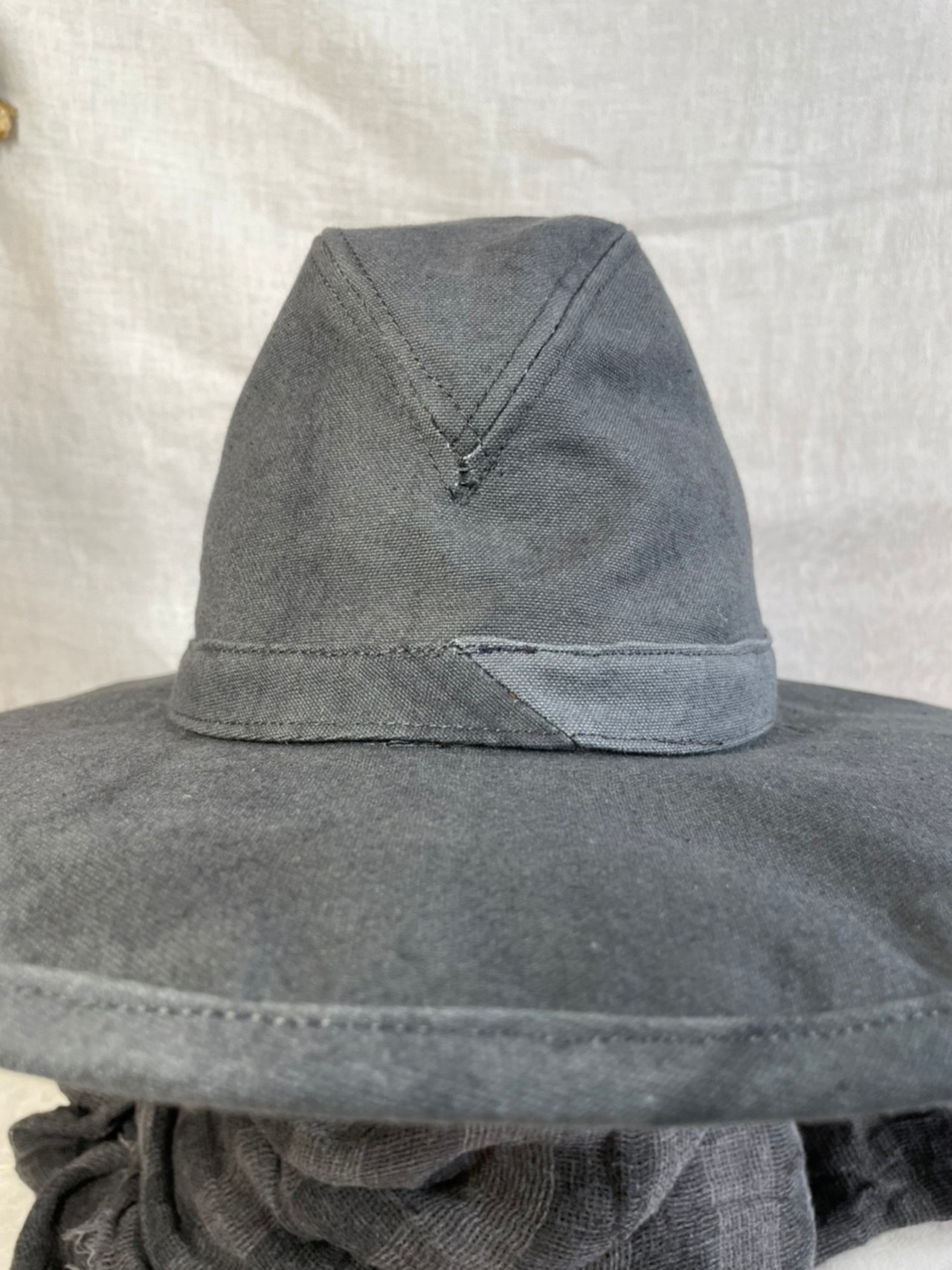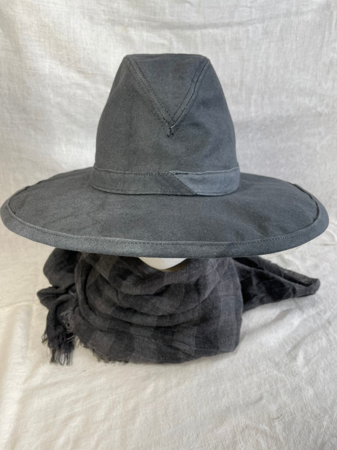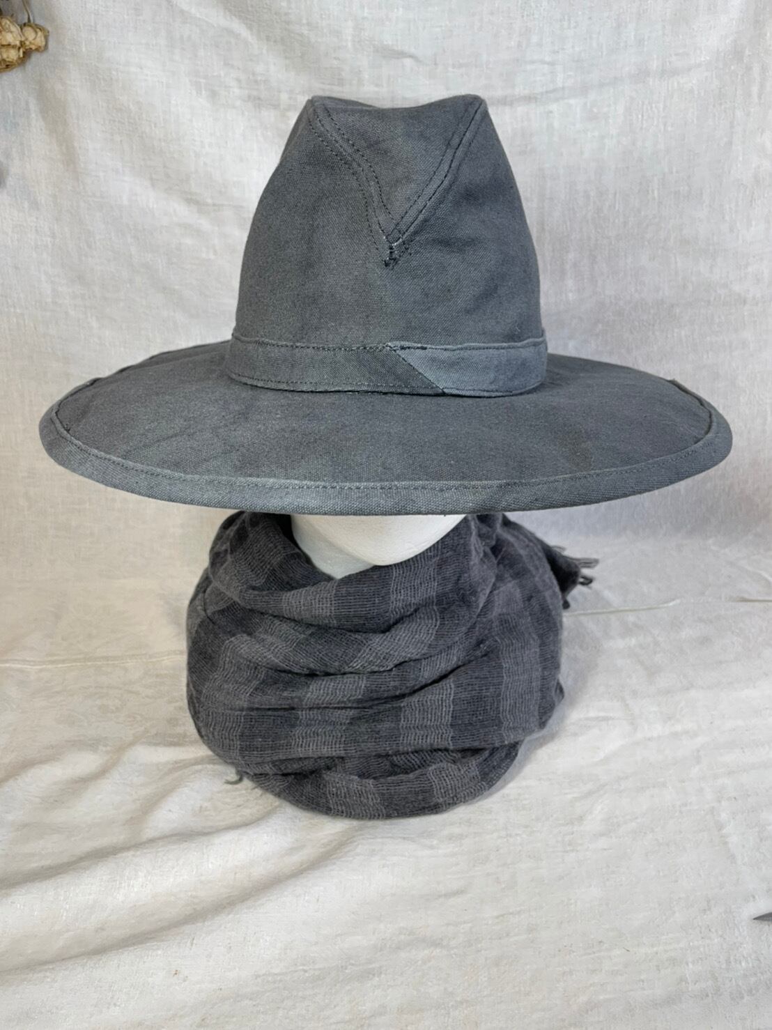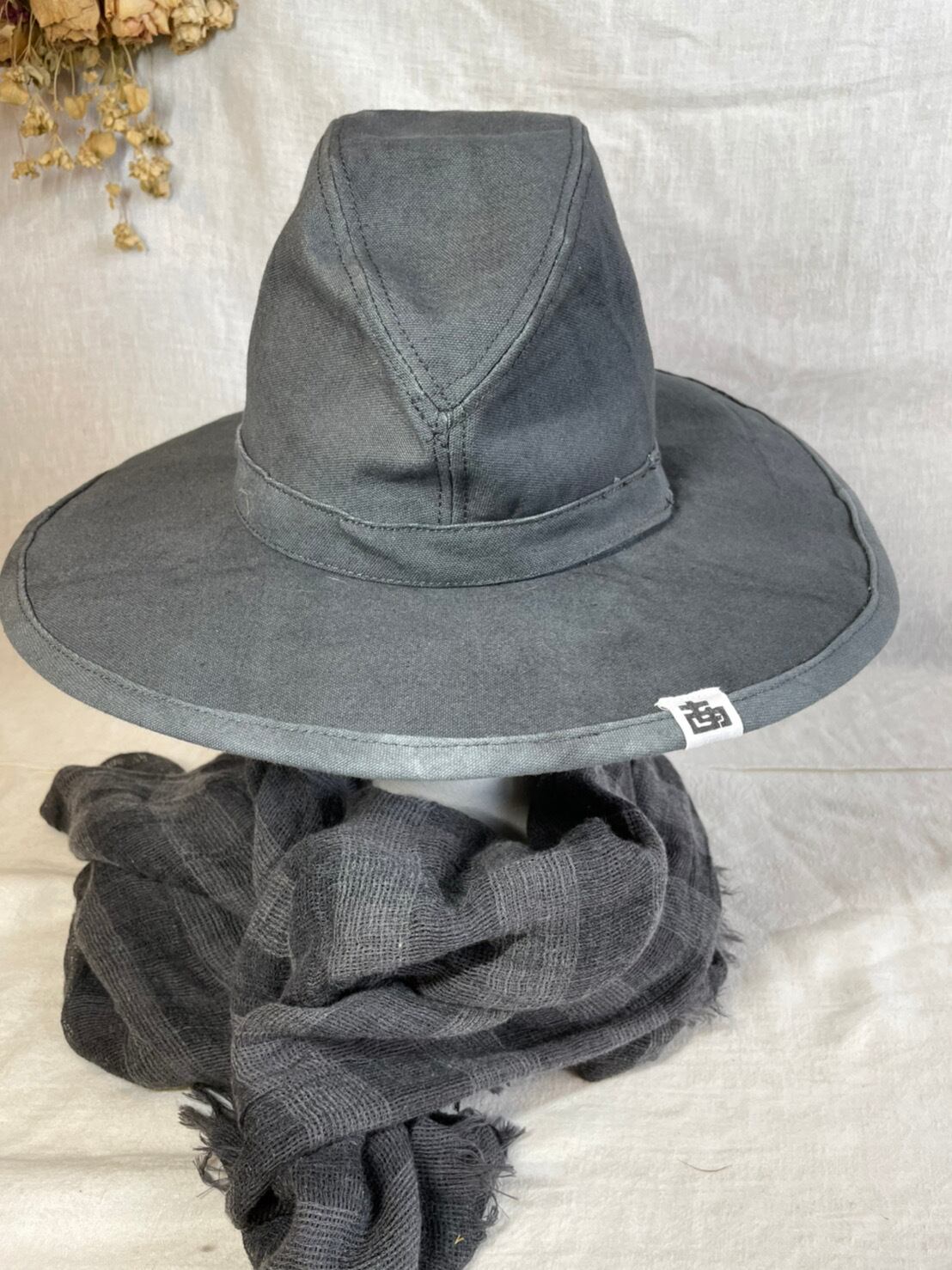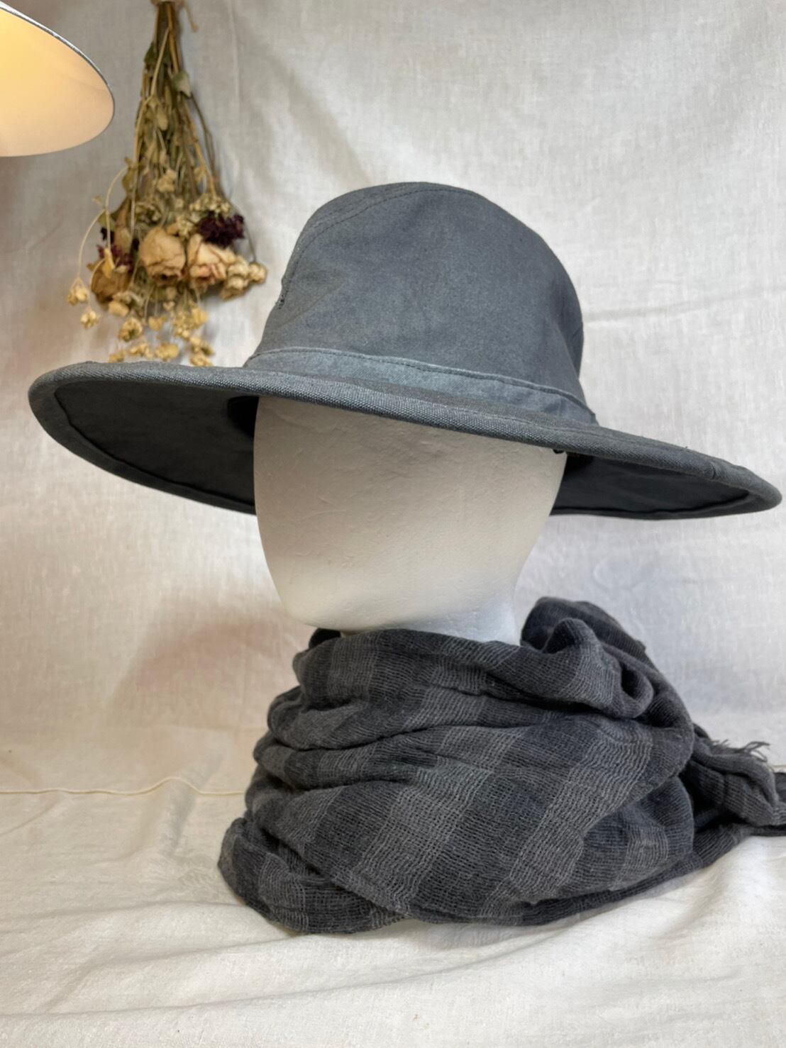 旅(巡礼)をコンセプトに旅人をデザインした染めムラとシンプルなクラウンが印象的なツバ広ハットです。