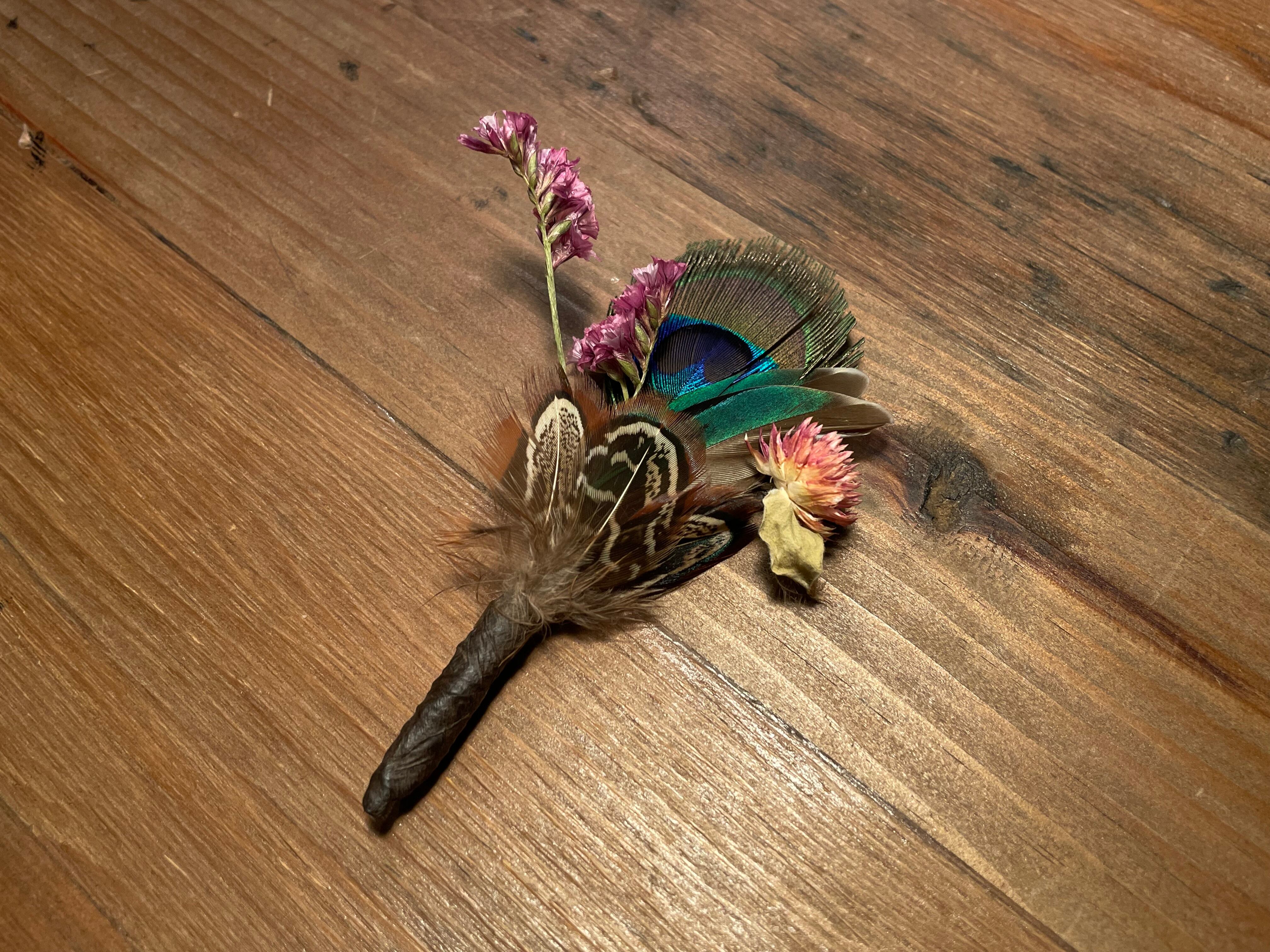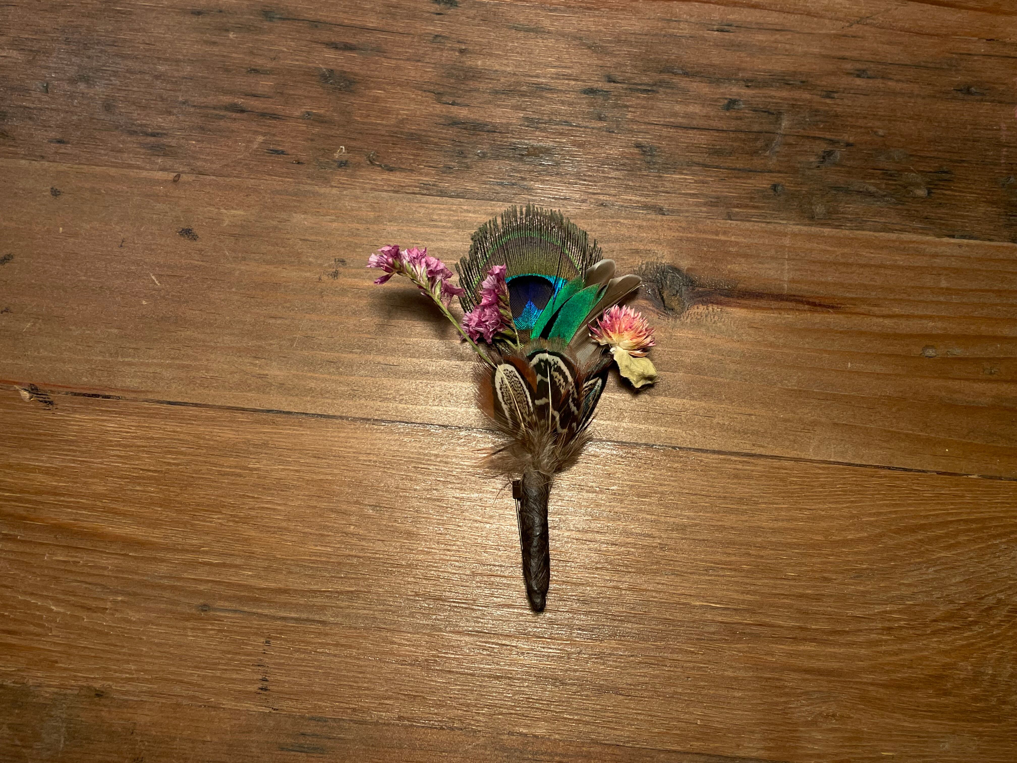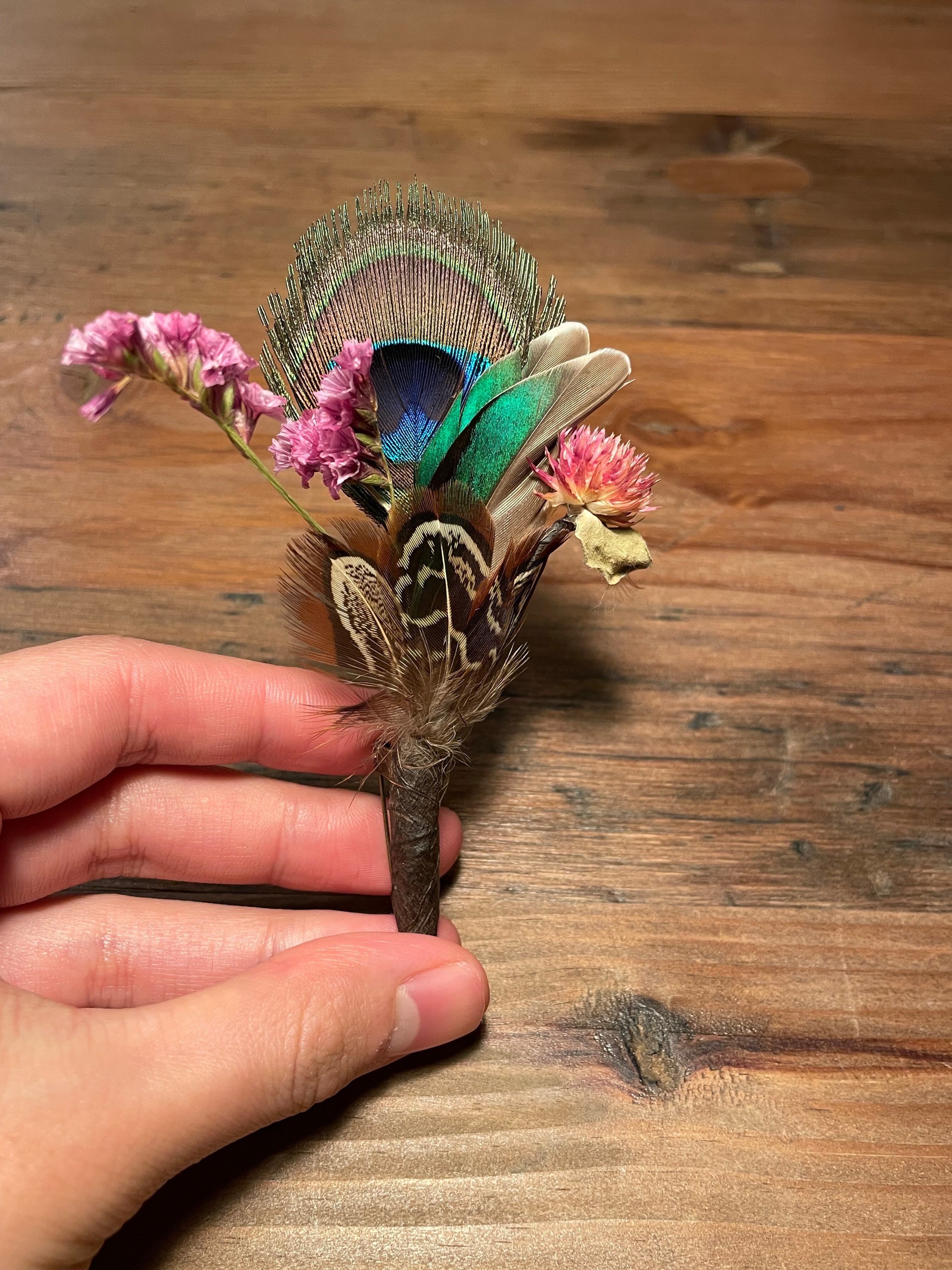 キジ、カモ、クジャクの羽とドライフラワーで作ったブローチになります。